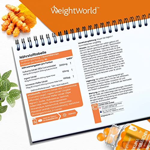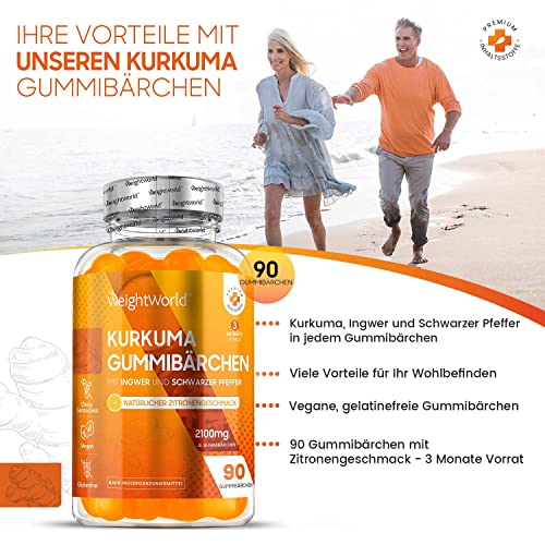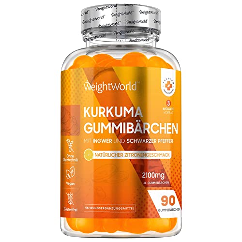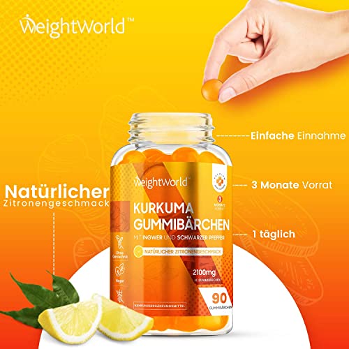 Kurkuma Extrakt Gummibärchen – 2100mg – Mit Ingwerpulver & Schwarzer Pfeffer – Natürlicher Zitronengeschmack – 95% Curcuminoide – 3 Monate Vorrat – 90 Gummies – WeightWorld