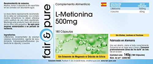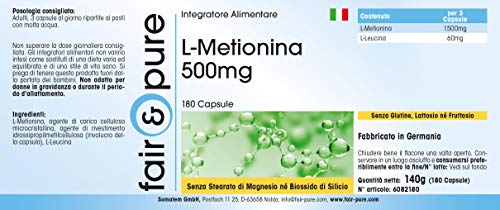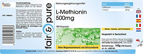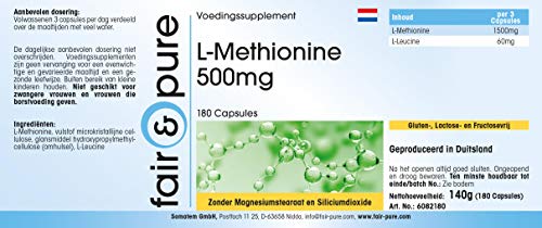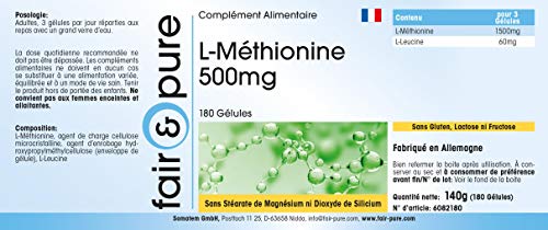 Fair & Pure L-Methionin 500mg, 180 Kapseln, hochdosiert, Nahrungsergänzungsmittel vegan ohne Magnesiumstearat, in Deutschland hergestellt