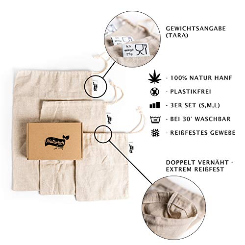 Natürlich Hanf – 3er Set Brotbeutel aus 100% Natur Hanf in drei praktischen GröÃen – Plastikfrei Einkaufen mit den wiederverwendbaren Brötchenbeutel – Mehrweg Brotsack mit Gewichtsangabe (TARA)