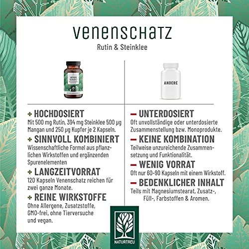 Rutin Steinklee Komplex 120 Kapseln – 500mg Rutin hochdosiert & 394mg Steinklee – Pflanzliche Alternative zu Venenkapseln Venentabletten – Vegan – Venenschatz von NATURTREU